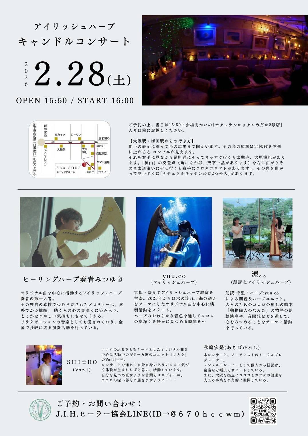 ![]() ヒーリング仕様の安らぎの空間で、キャンドルのあたたかな灯りに包まれながら心と身体で聴く癒しの音色のアイルッシュハープ(+朗読)コンサートです。 -イリッシュハープ奏者みつゆき+朗読&ハープユニット 涙。による生演奏です。(ゲストあり) 日付:2025年12月20日(土) 前売り券:3,500円(リピーター様 3,000円となります。店舗でお支払いの場合はその旨をお伝えください。) 会場:sea.son ヒーリングルーム(大阪市北区太融寺町 1-17) 出演者: